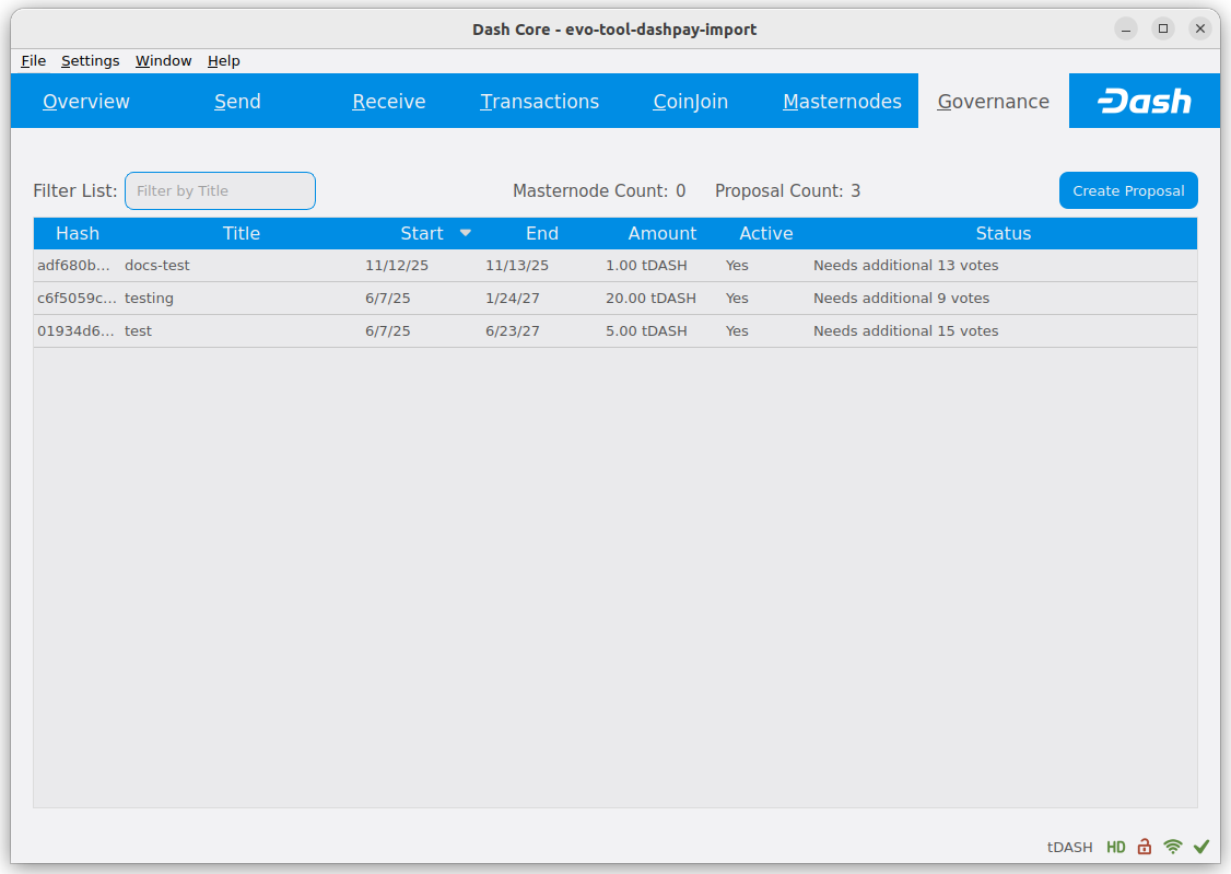 If you started your masternode from a hardware wallet using DMT, you can also use the tool to cast votes. Click Tools > Proposals and wait for the list of proposals to load. You can easily see the voting status of each proposal, and selecting a proposal shows details on the Details tab in the lower half of the window. Switch to the Vote tab to Vote Yes, Vote No or Vote Abstain directly from DMT.