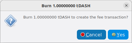 Click Yes on the confirmation dialog to broadcast the fee transaction.