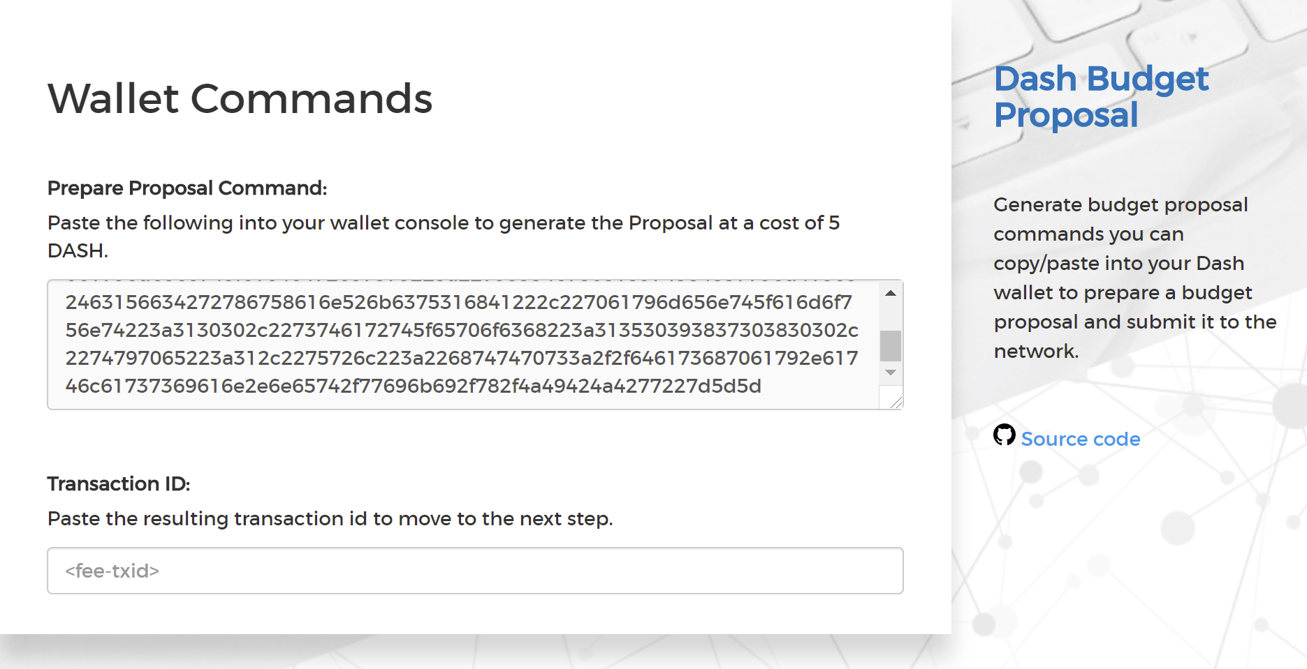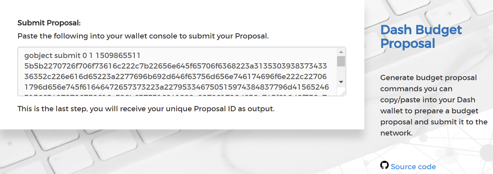 Next, the proposal generator will provide you with a command to run from the console of your Dash Core wallet to prepare your budget proposal governance object. Running this command will cost you 1 DASH, which will be “burnt” or permanently removed from circulation. This one-time fee protects the governance system from becoming overwhelmed by spam, poorly thought out proposals or users not acting in good faith. A small transaction fee is charged as well, so make sure slightly more than 5 DASH is available in your wallet. Many budget proposals request reimbursement of the 1 DASH fee.