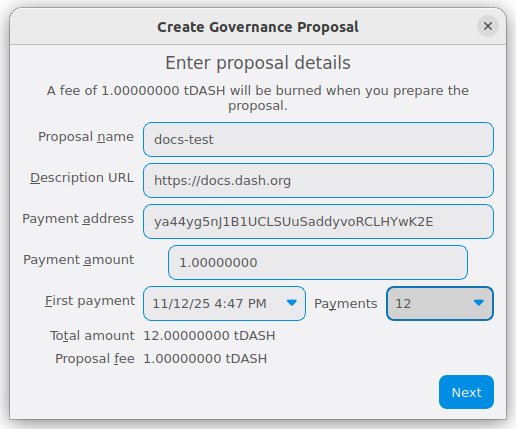 Dash Core Wallet includes a built-in graphical interface for creating governance proposals directly from the Governance tab. This provides a user-friendly alternative to using external web tools or manual console commands. To use this feature, your wallet must be unlocked and contain sufficient balance to cover the 1 DASH proposal fee plus a small transaction fee.