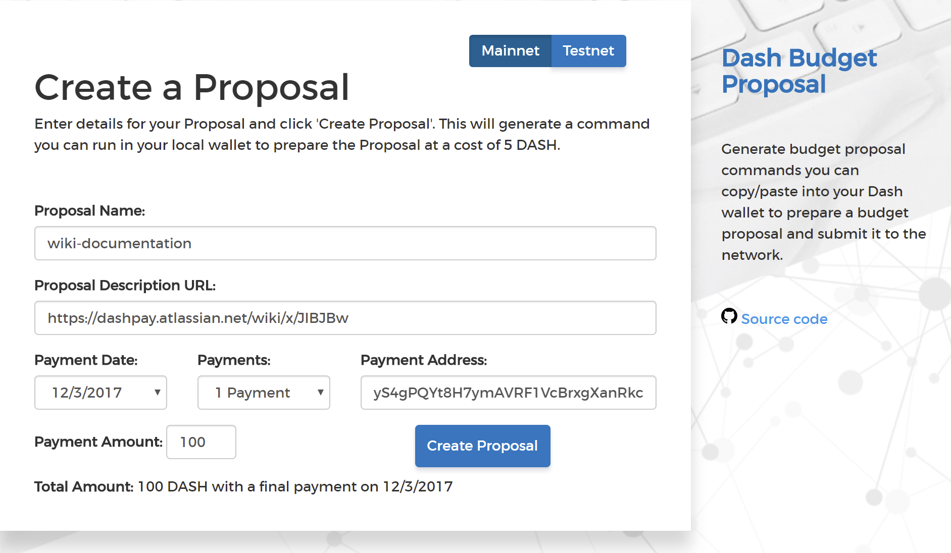 The Dash Budget Proposal Generator supports creating budget proposals on both mainnet and testnet. In the first step, you must enter a short, clear and unique name for the proposal as it will appear on the blockchain. Proposal names are limited to 40 characters. You can then provide a link to the forum or DashCentral where your proposal is described in more detail (use a URL shortening service if necessary), as well as select the amount of payment you are requesting, how often the payment should occur, and the superblock date on which you are requesting payment. This allows you to control in which budget period your proposal will appear, and gives you enough time to build support for your proposal by familiarising voters with your project. Note that the payment amount is fixed and cannot be modified after it has been submitted to the blockchain.