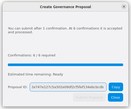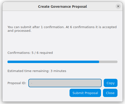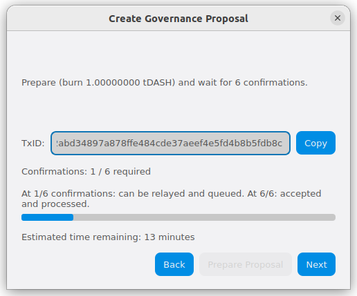 Step 3: Creating the proposal transaction and waiting for 6 confirmations of the transaction ID#