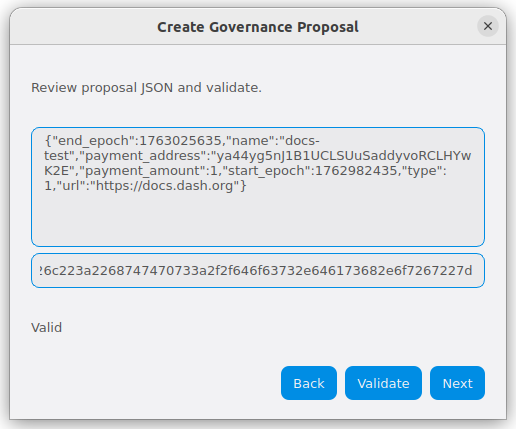 The wallet will generate and display your proposal data in JSON format along with the proposal hash. Review the information carefully to ensure accuracy.