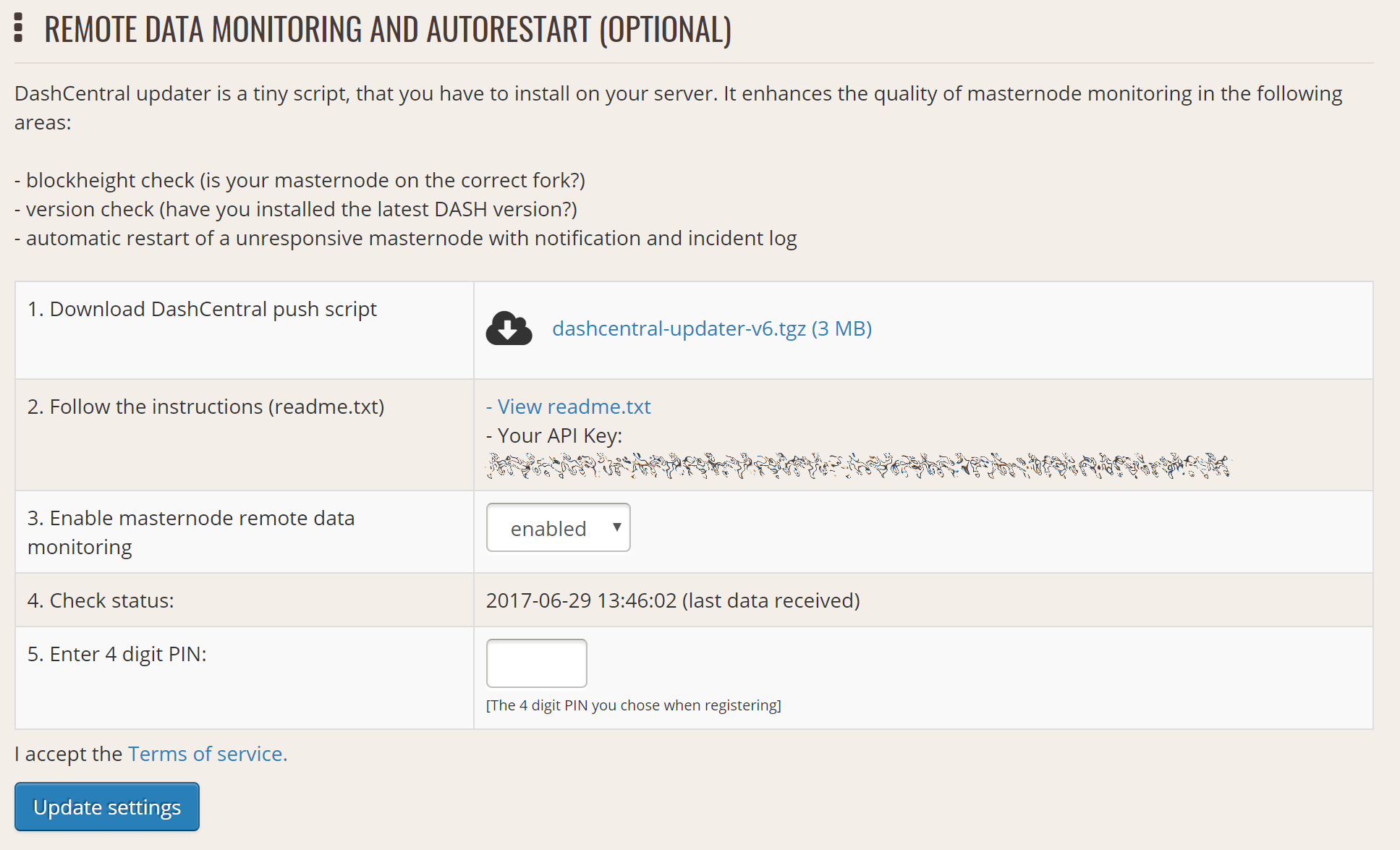 DashCentral offers a service to monitor your masternode, automatically restart dashd in the event of a crash and send email in the event of an error. Go to the Account settings page and generate a new API key, adding a PIN to your account if necessary. Scroll to the following screen: