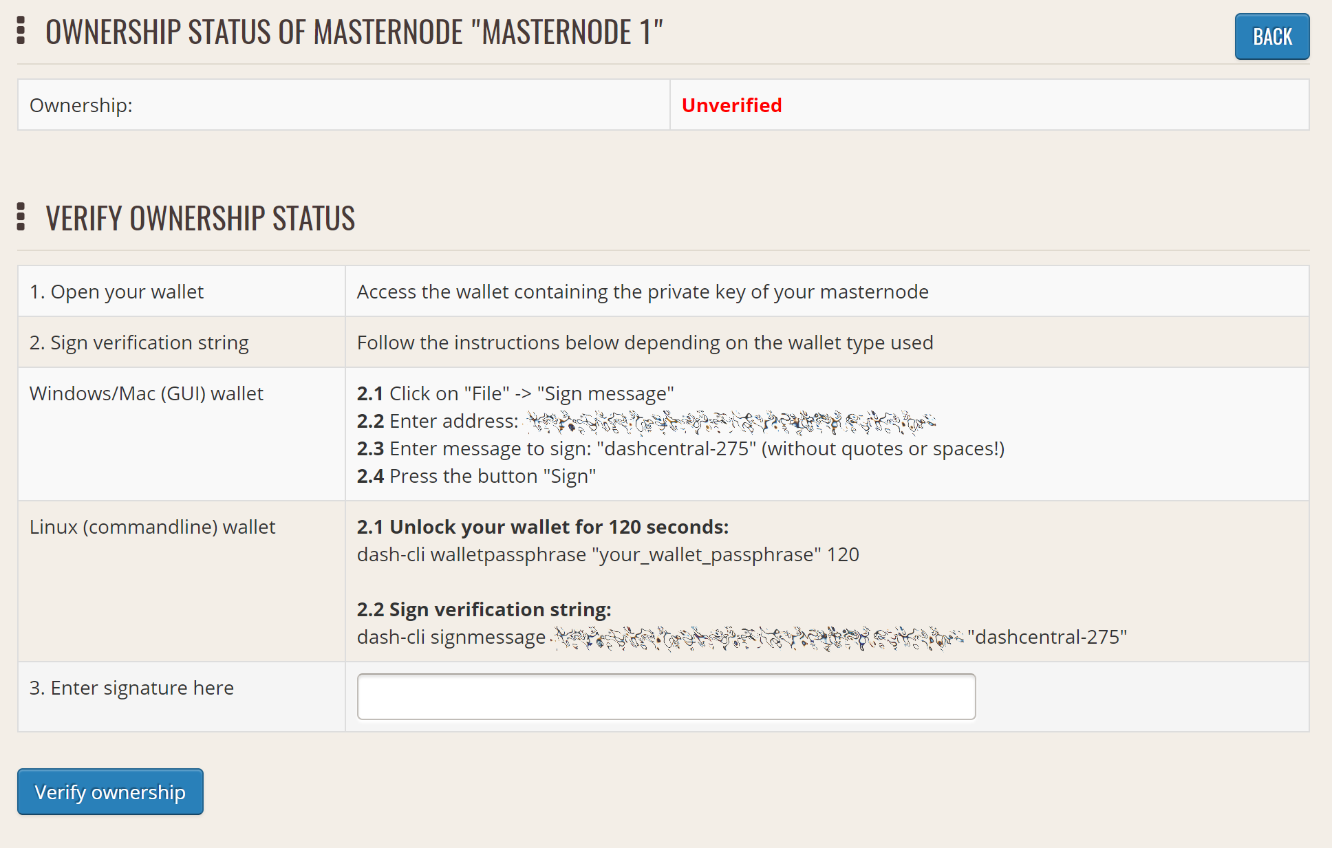 You can also issue a message from your address to verify ownership of your masternode to DashCentral. Click Unverified under Ownership and the following screen will appear: