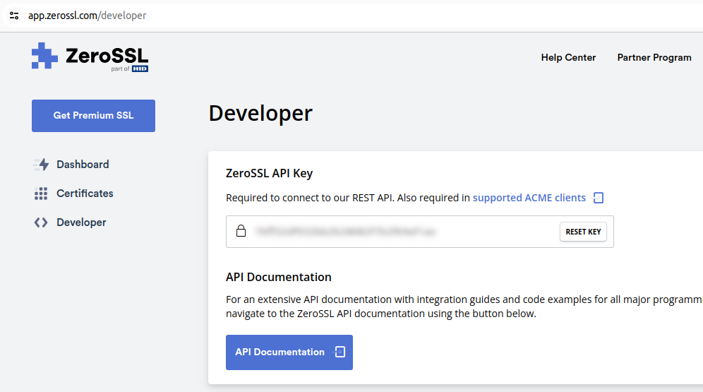 ZeroSSL Developer tab showing the API key#