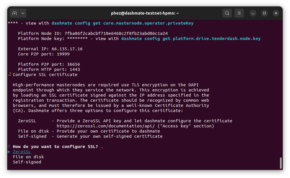 Dash Platform requires SSL for communication. Dashmate provides several options for obtaining the required SSL certificate.