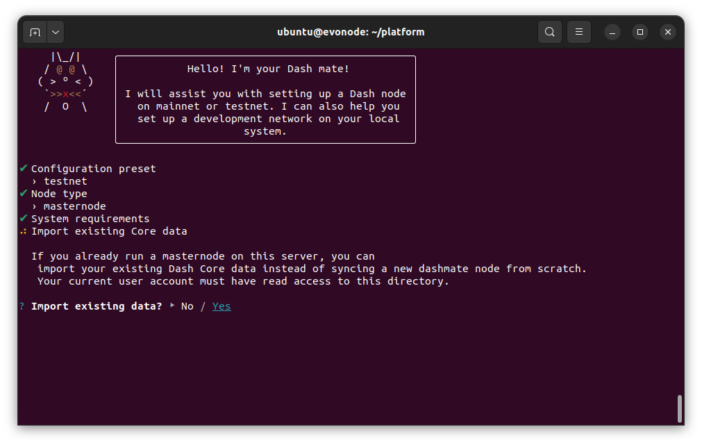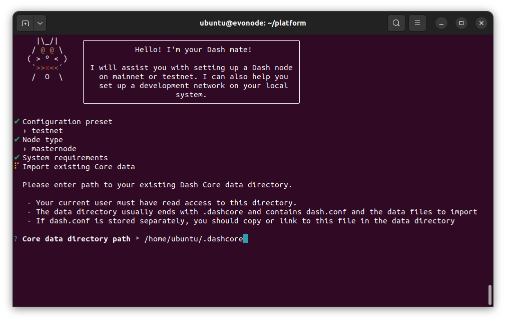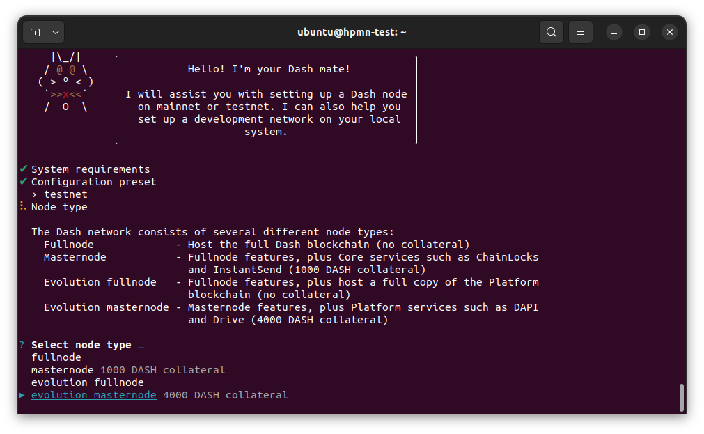Dashmate is primarily recommended for setting up Evolution masternodes (evonodes). With the exception of a few minor extra steps for evonodes, the process is identical for evonodes and regular masternodes. Complete the steps in the sections below to set up your node or follow along with this step-by-step tutorial.