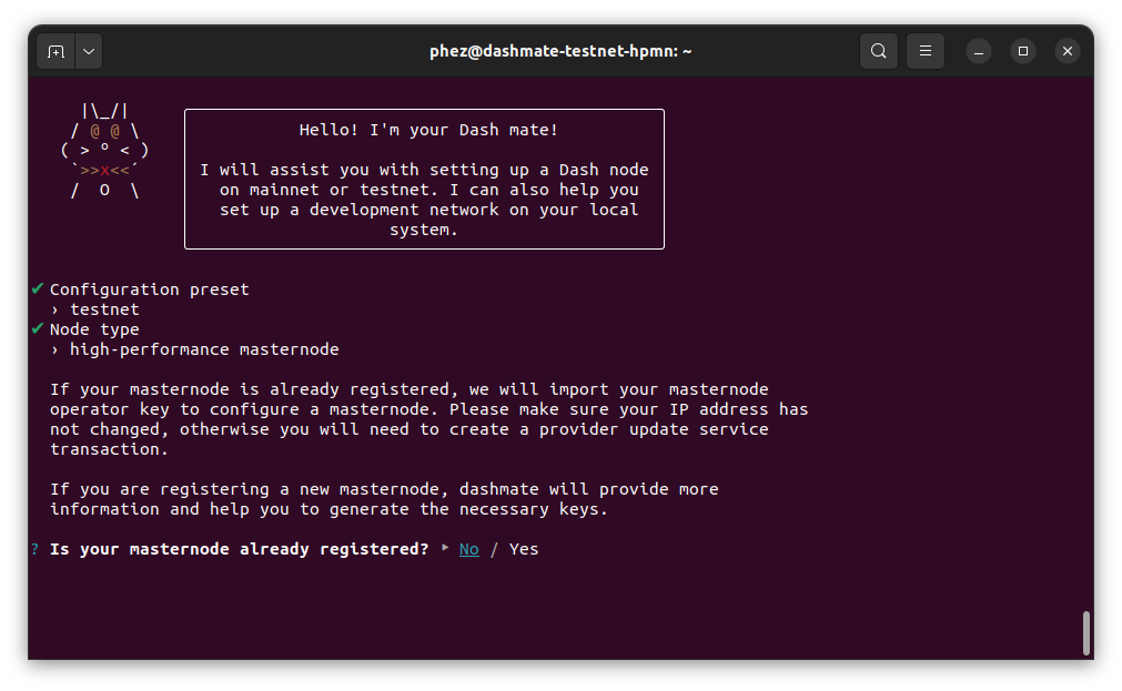 To begin masternode setup, run dashmate setup to start the interactive wizard: