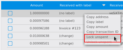 Right click on the transaction(s) you do not want to spend, then select Lock unspent. A small lock will appear next to the transaction. You can click the Toggle lock state button to invert the locked/unlocked state of all UTXOs. When you are ready to continue, click OK. You can now safely create transactions with your remaining funds without affecting the locked UTXOs.