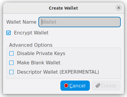 You will be prompted to create a new wallet with a custom wallet name. By default, your wallet will be encrypted. You may choose to uncheck the box and encrypt the wallet later. We have included instructions on how to encrypt your wallet in the following section.