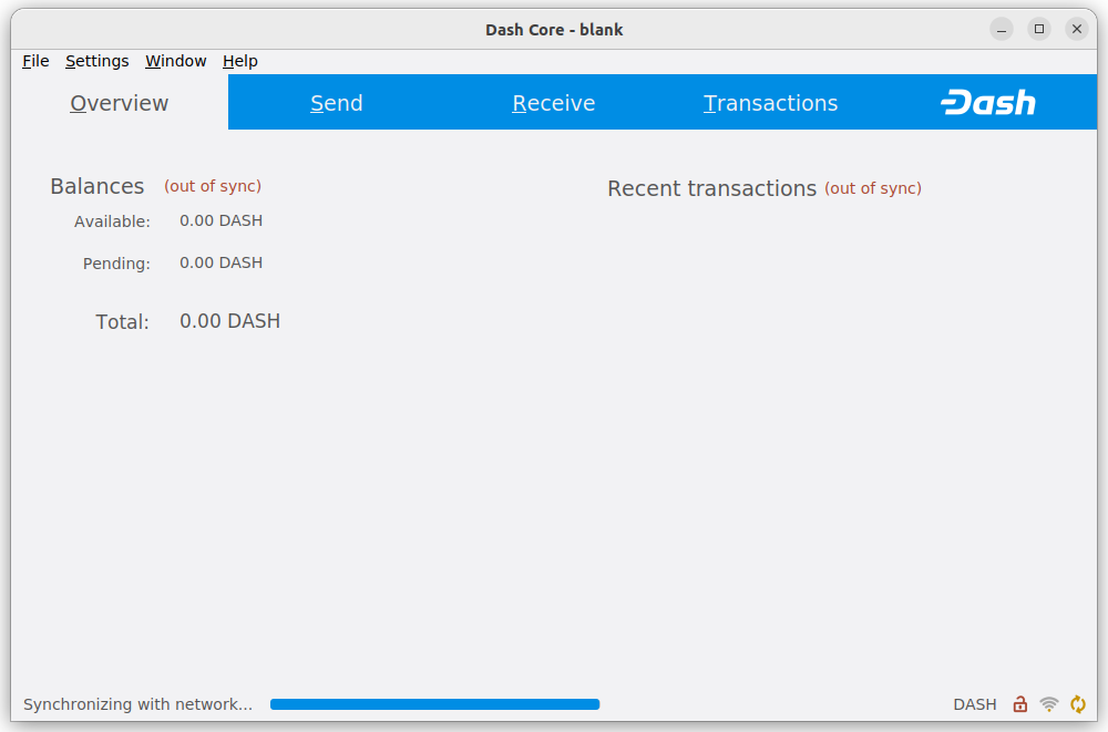 Once Dash Core is successfully installed and started, you will see the wallet overview screen. You will notice that the wallet is “out of sync”, and the status bar at the bottom of the window will show the synchronization progress.