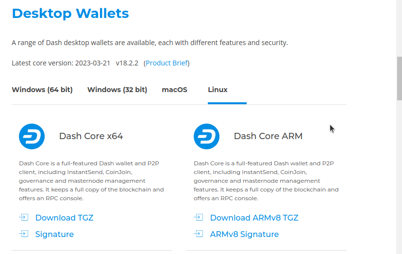Since Dash Core 18.0, downloads are not available for 32-bit Linux installations.