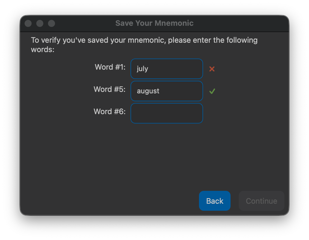 As you enter each word correctly, a green checkmark will appear beside it. Once you have successfully verified your mnemonic, click Continue to complete the wallet creation process.