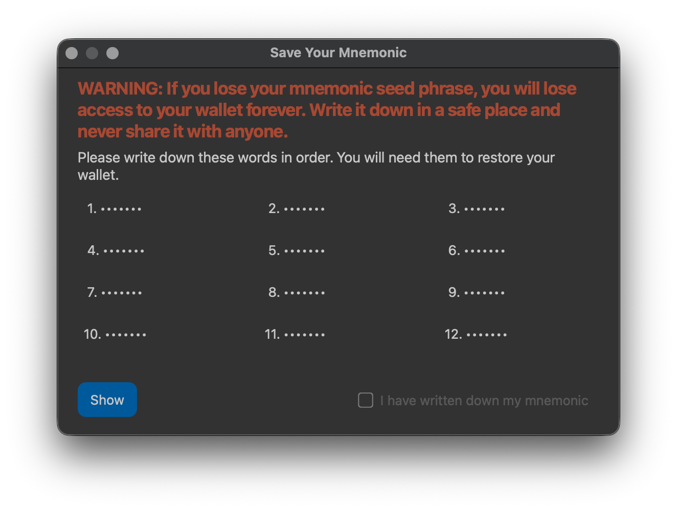 Click the Show button to reveal your mnemonic phrase. Then, write down all the words in order and check the “I have written down my mnemonic” checkbox to continue.