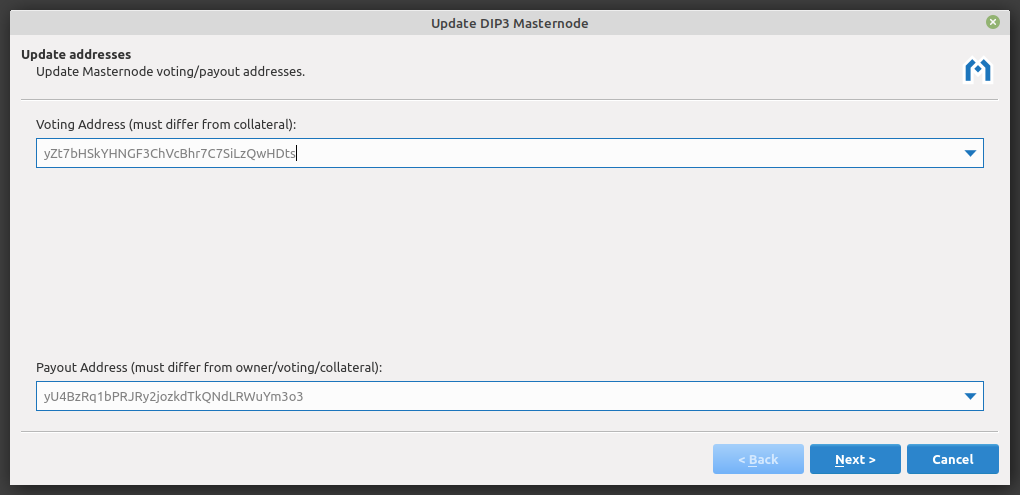 The masternode owner may update the voting and payout addresses at any time. Addresses from the current wallet can be selected from the drop down menu or addresses from a different wallet (e.g. a hardware wallet) can be pasted into either field. Click Next to continue.
