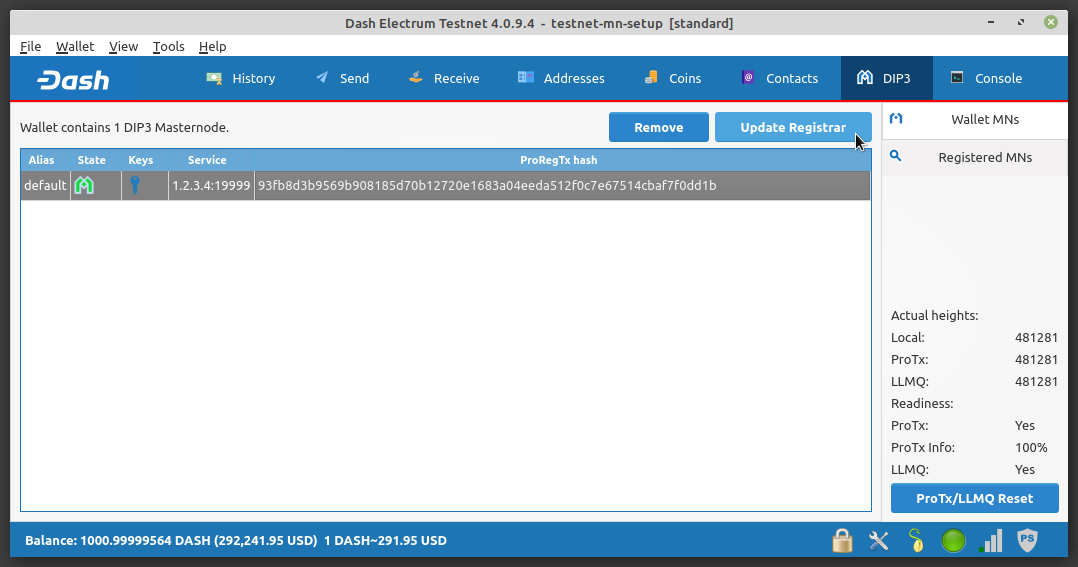To update masternode registration information, navigate to the DIP3 tab and click the Update Registrar button.
