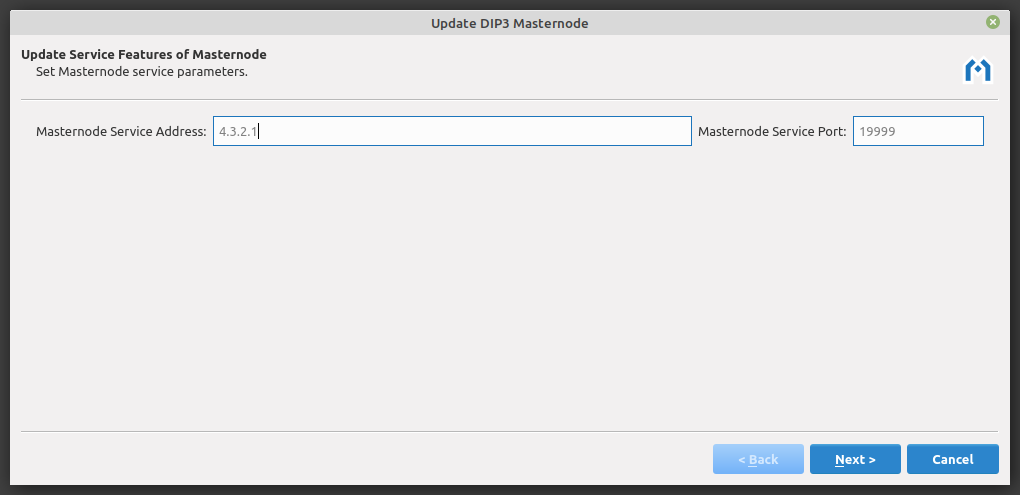 The masternode operator may update the IP address and port at any time. Update the IP address and click Next to continue.