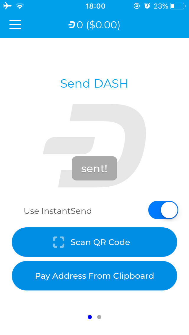 The Send DASH screen gives you two options to enter the payment address: Scan QR Code or Pay Address From Clipboard. You can choose to use InstantSend for instant confirmation, or disable this to send a normal transaction which will require more time for confirmation. Depending on the code you are scanning, the amount of Dash requested may be included, or you can enter it yourself. A confirmation screen will appear to explain the fee structure and request your unlock code (PIN or TouchID). The transaction will then be sent.
