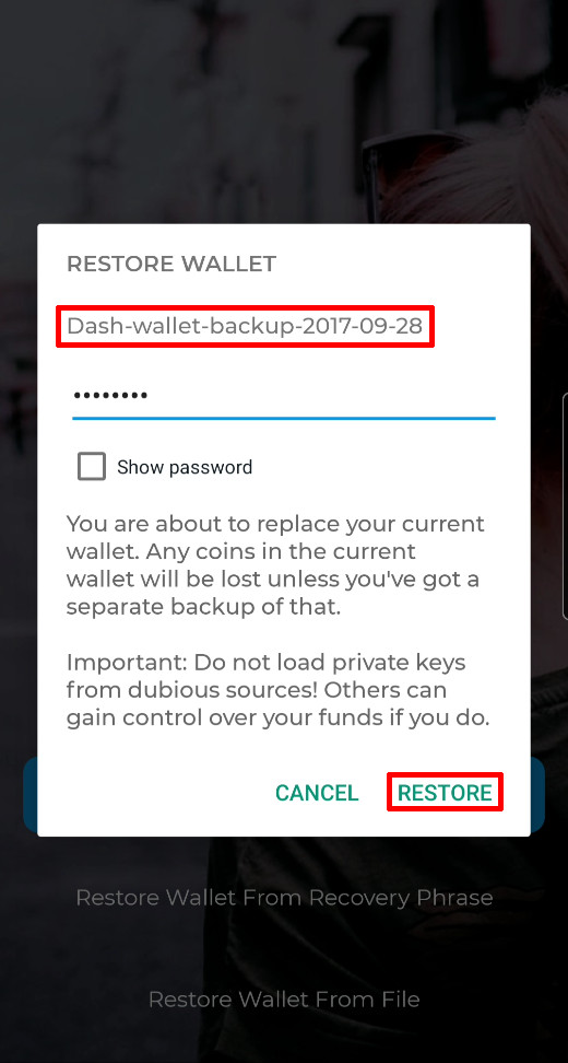 Restoring a 12-word recovery phrase using Dash wallet for Android