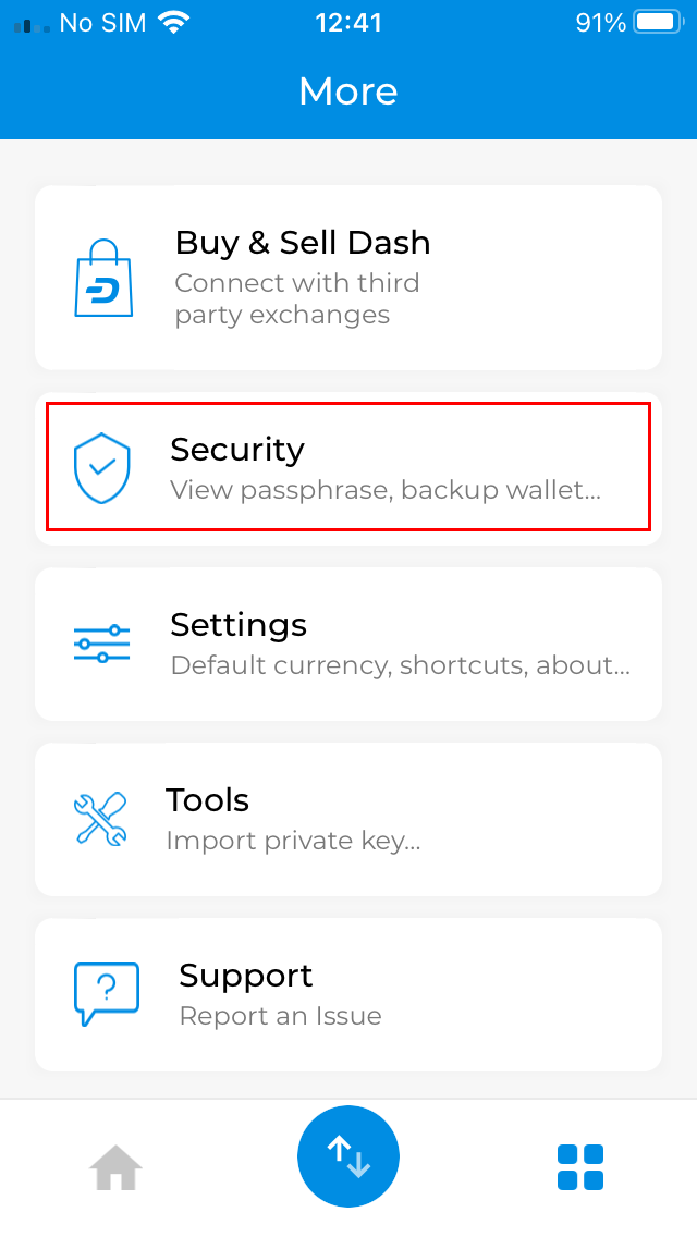 Ensure your Dash wallet is fully updated in the Play Store, then open Dash. If you have an existing balance, either view and write down your recovery phrase or transfer your balance to an external address, because restoring a wallet will replace your existing wallet.