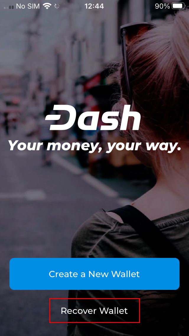 Ensure your Dash wallet is fully updated in the App Store, then open Dash. If this is the first time you are opening the app, you can enter your recovery phrase directly by selecting Recover wallet on the start screen. If you have an existing balance, either make another backup or transfer it to an external address, because restoring a wallet will replace your existing wallet!
