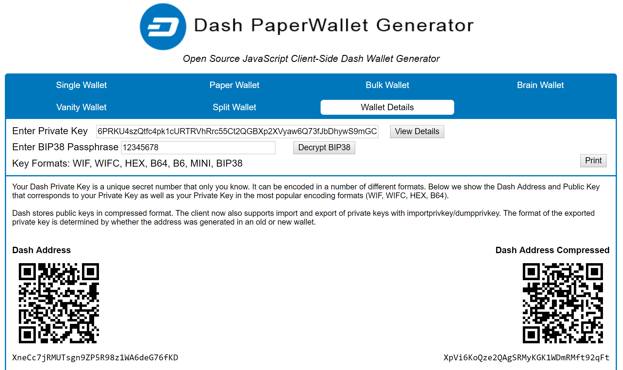 Decrypting a BIP38 encrypted key to WIF for import in Dash Core wallet